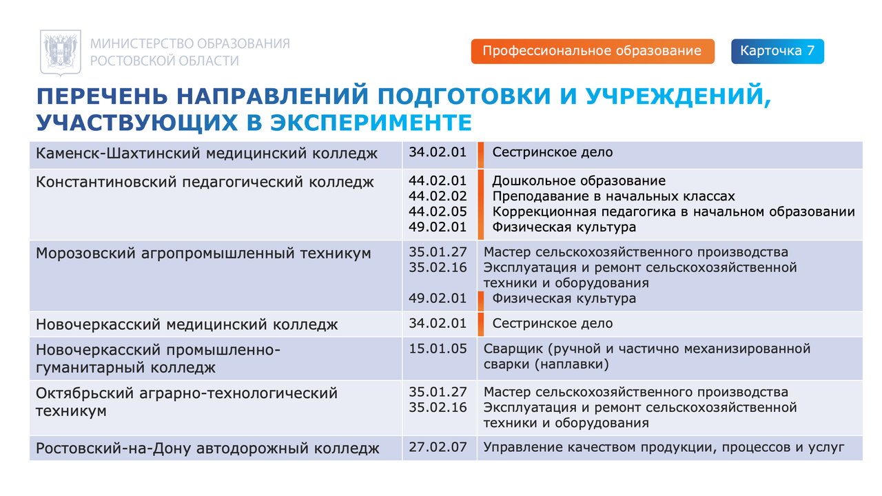 Перечень образовательных организаций, а также профессий и специальностей, участвующих в эксперименте